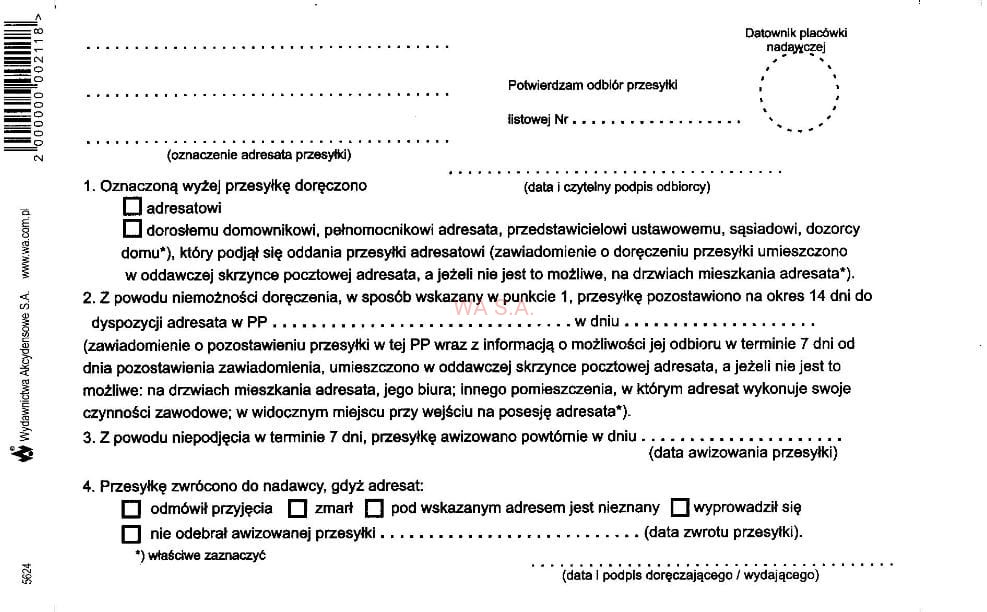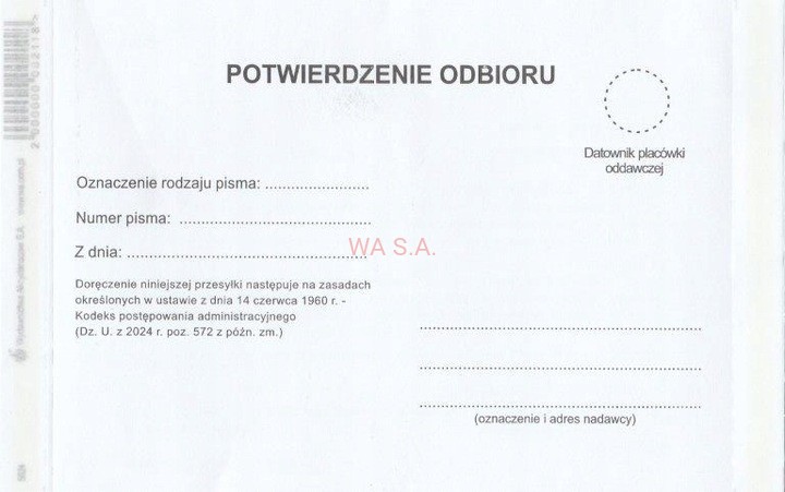 Zwrotne Potwierdzenie odbioru 2024