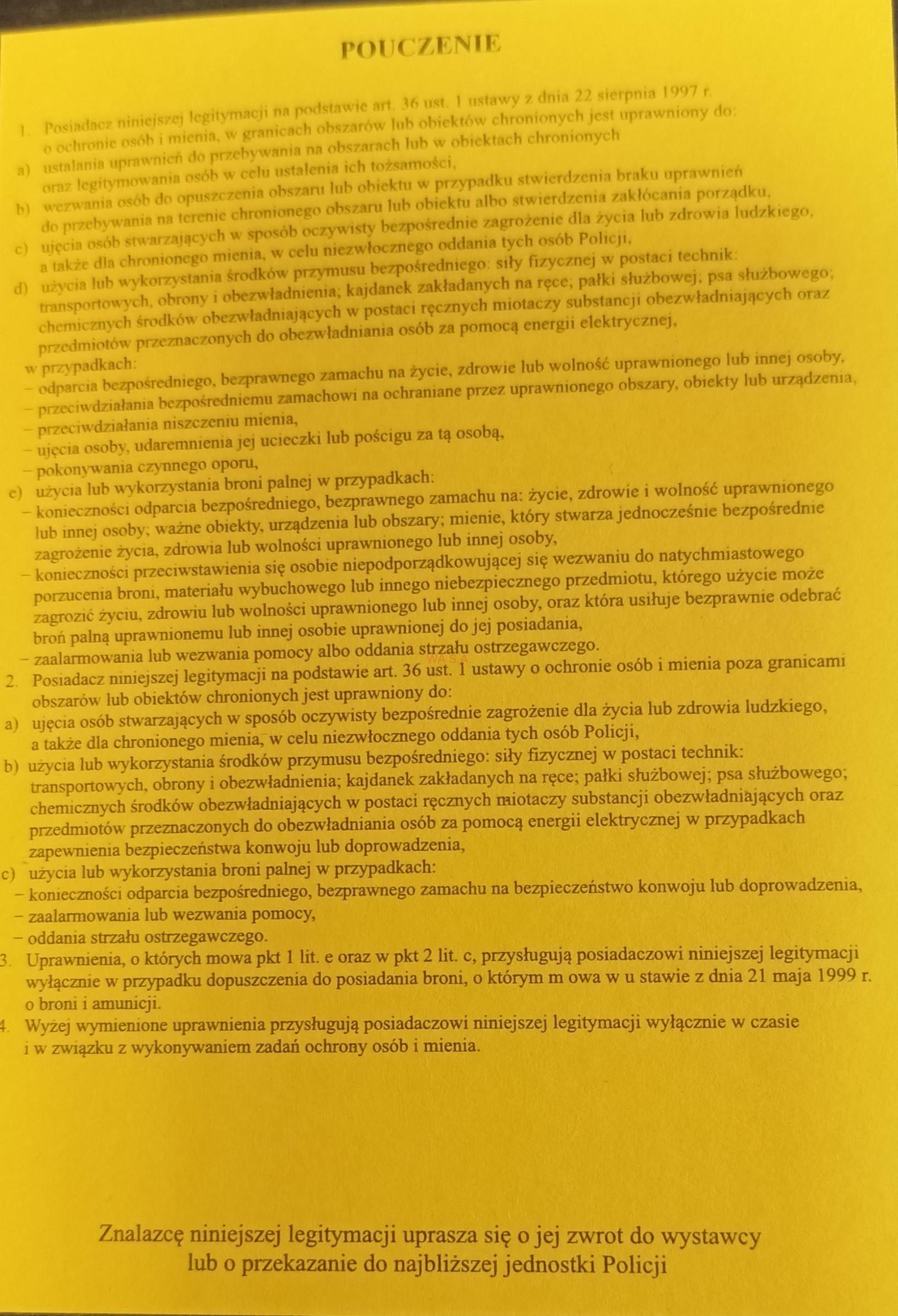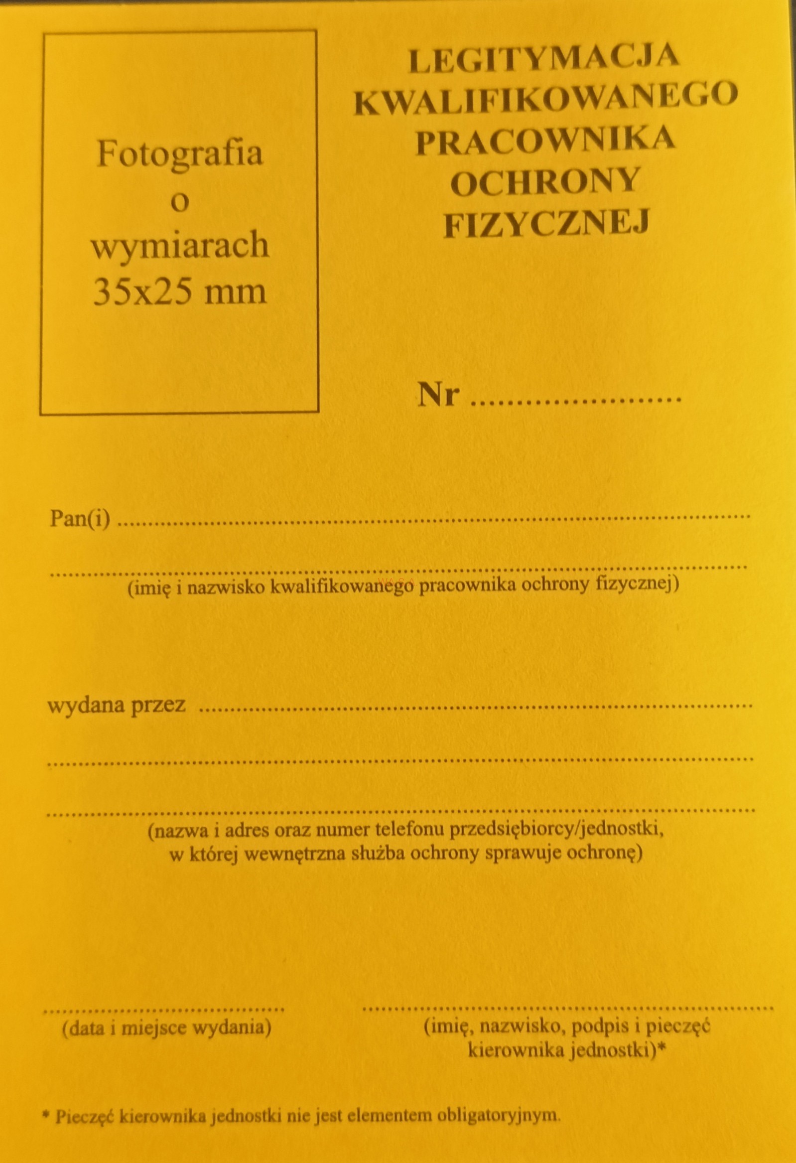 A 115 Legitymacja kwalifikowanego pracownika ochrony fizycznej, Format 100x70, Karton 230g., Kolor żółty 2+2, Wzór zgodny z Rozporządzeniem Ministra Spraw Wewnętrznych (Dz. U. 2017r. poz.1307)