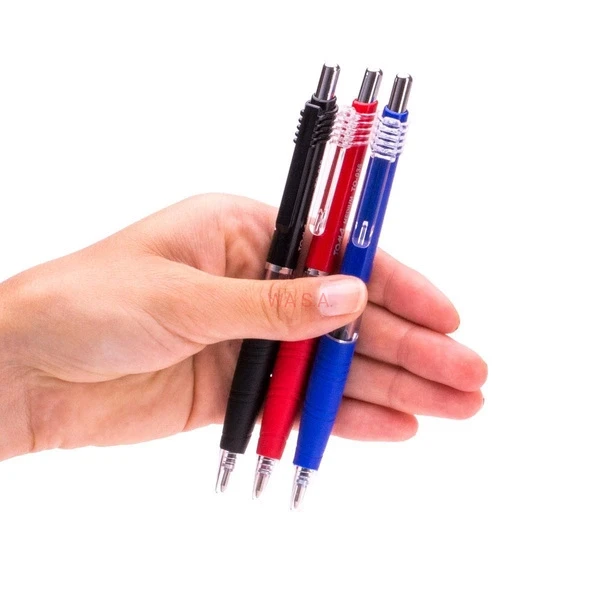 Długopis automatyczny w plastikowo-przezroczystej obudowie, czarny, wygodny, gumowany uchwyt, trwały mechanizm włączający, wymienne wkłady, trwała kulka z węglików spiekanych 1,0 mm, linia pisania 2000 m, tusz niebieski.