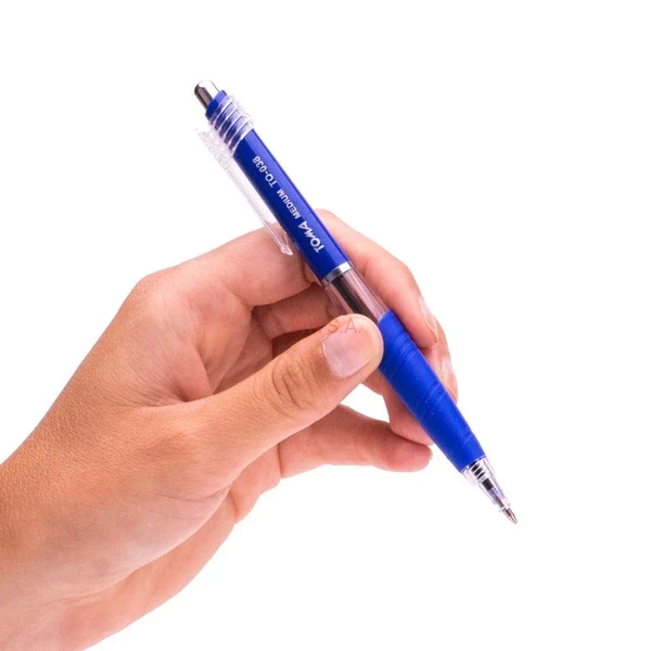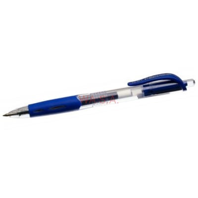 Długopis automatyczny w plastikowo-przezroczystej obudowie, czarny, wygodny, gumowany uchwyt, trwały mechanizm włączający, wymienne wkłady, trwała kulka z węglików spiekanych 1,0 mm, linia pisania 2000 m, tusz niebieski.