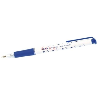 Długopis automatyczny SUPERFINE, w plastikowej obudowie w gwiazdki w kolorze tuszu, trwała kulka z węglików spiekanych 0,5mm, linia 4000m, trwały mechanizm włączający, wygodny, gumowany uchwyt.