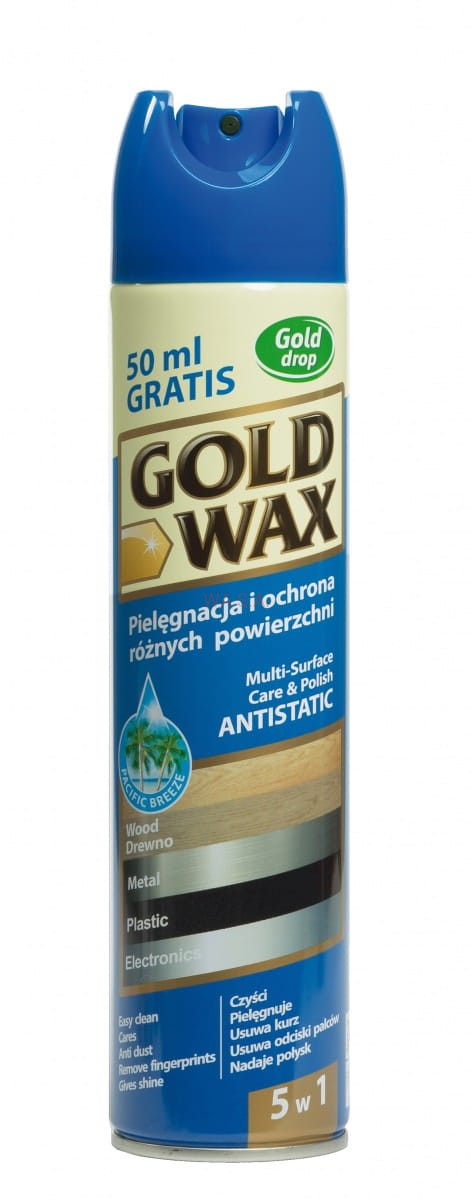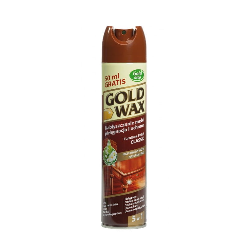 Gold Wax Spray nadaje czyszczonym powierzchniom połysk nie pozostawiając przy tym smug. Zawartość składnika antystatycznego pomaga skutecznie pozbyć się kurzu i zapobiega jego ponownemu osadzaniu się na powierzchniach. Dodatkowe pozostawia świeży i przyjemny zapach w pomieszczeniu Gold Wax Spray to produkt niezastąpiony do pielęgnacji mebli w domu i biurze.